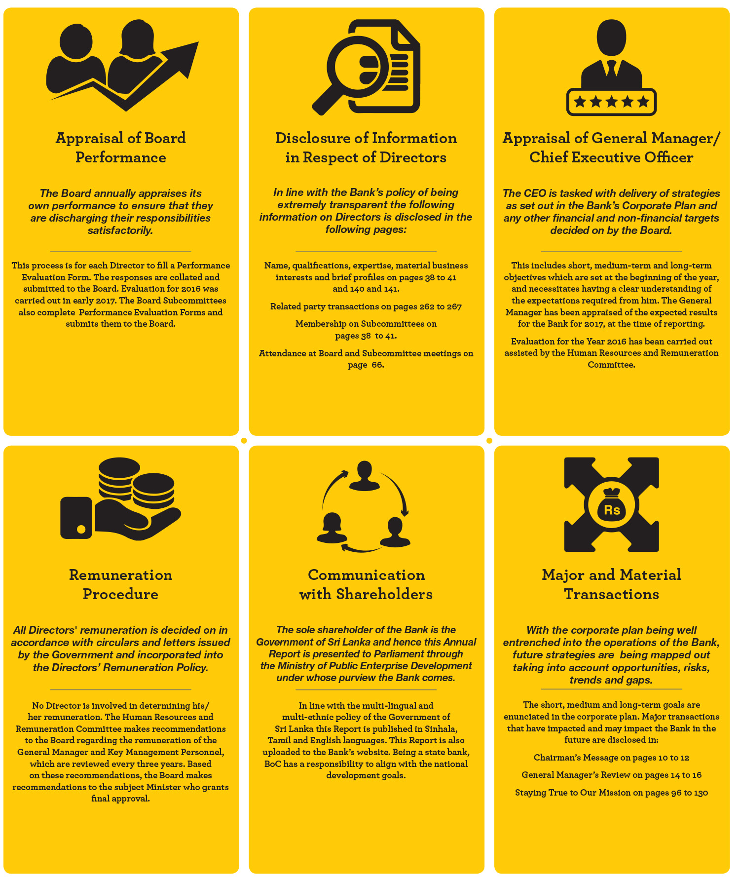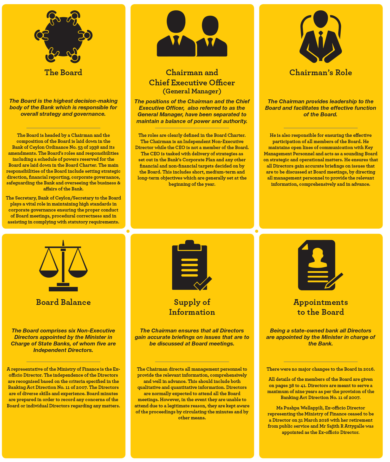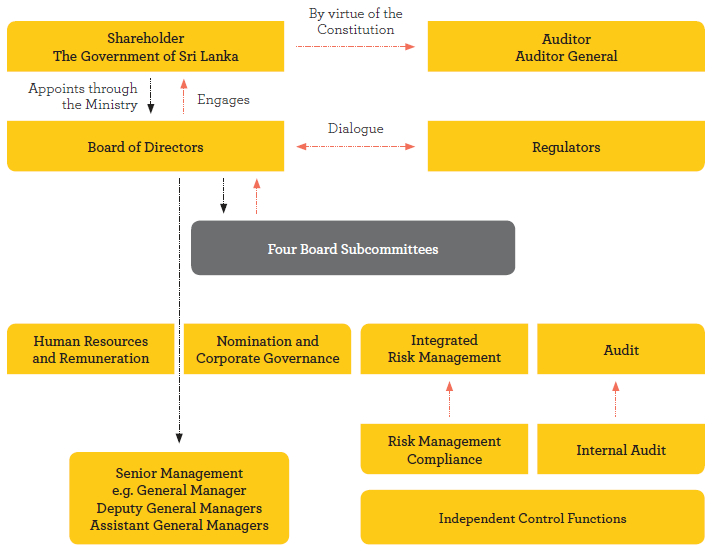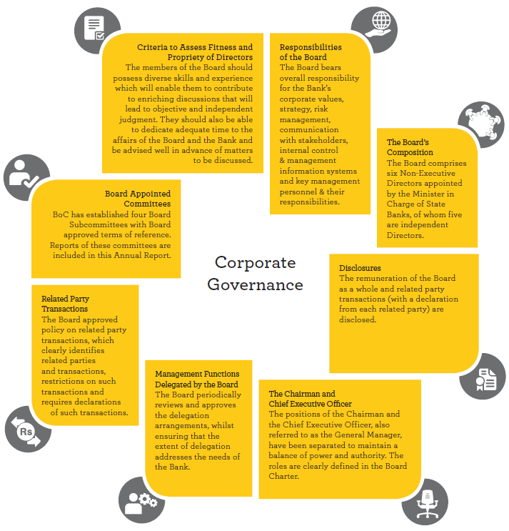 Our corporate governance is one of our strengths that has helped to bring us to the position we occupy within the Banking industry in Sri Lanka. We give great importance to adhering to best-in-class corporate governance practices. It guides us in all aspects of our operations, including the manner in which we interact with our stakeholders, in order to ensure transparency and conformance with applicable rules and regulations. When the new Basel III capital requirements issued by the Central Bank of Sri Lanka come into effect in 2017, Bank of Ceylon will be classified as a domestic systemically important bank. Thus, the Board of Directors realises the responsibility it carries in maintaining the soundness of the Bank vis–à–vis the soundness of the domestic banking sector. The governance standards that we have been following make us stand out in the industry.