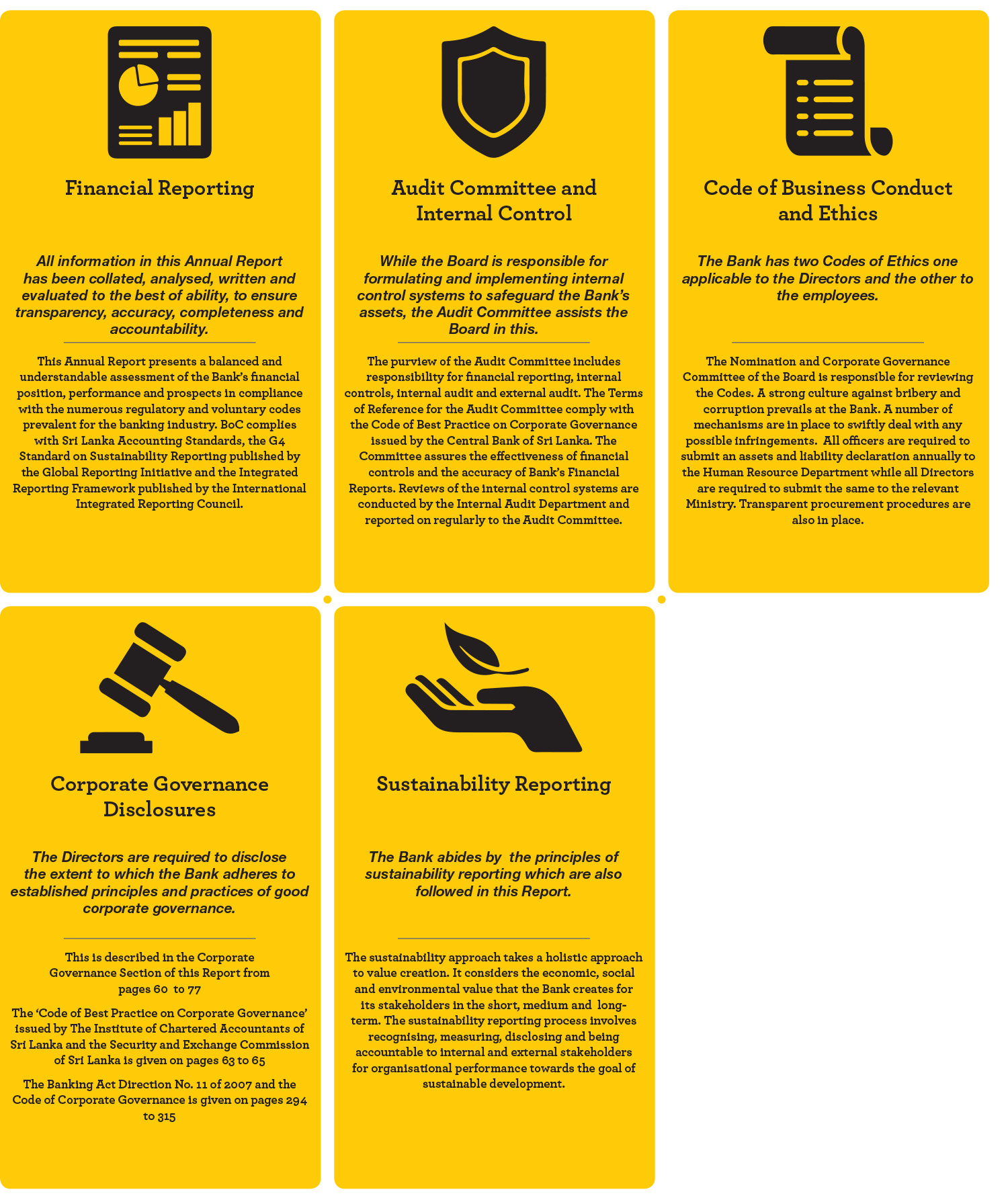 Being a licensed commercial bank, BoC is subject to the prudential supervision of the primary banking regulator, the Central Bank of Sri Lanka. As such, the regulatory framework applicable to BoC mainly consists of the Banking Act No. 30 of 1988 and amendments thereto, regulations issued under the Banking Act, particularly Direction No. 11 of 2007 on Corporate Governance. The Bank of Ceylon Ordinance No. 53 of 1938 and its amendments also constitute a part of the regulatory framework. In addition, the Bank voluntarily complies with the Code of Corporate Governance issued jointly by The Institute of Chartered Accountants of Sri Lanka and the Securities and Exchange Commission. Bank is exempted from disclosure of compliances as stipulated in Section 7.10 of the Continuing Listing Requirements on Corporate Governance.