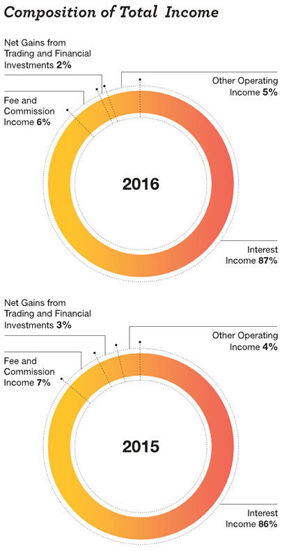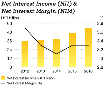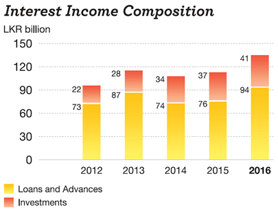 In 2016, many policy rates were changed affecting the market interest rate to move upward. In January 2016, Statutory Reserve Ratio (SRR) was increased by 150 basis points (bps) to 7.5% and Standing Lending Facility Rate (SLFR) and Standing Deposit Facility Rate (SDFR) also increased during the year up to 8.5% and 7.0%. Whilst, the increasing trend in market interest rates has resulted in an increase in both interest income and expenses, the Bank has managed to grow its net interest income by 17% from previous year. Interest Income from loans and advances increased by 24% during the year backed by 21% growth in loan portfolio. Interest income from investments, which accounted for 30% of the interest income grew by 10%, mainly backed by interest income from Government securities.