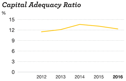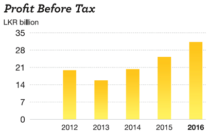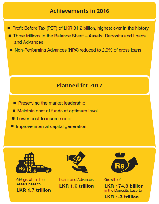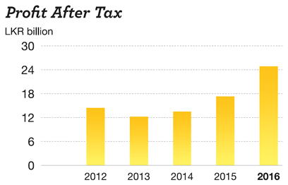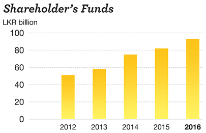 A significant increase of 14% was reported in shareholder’s funds which stood at LKR 92.8 billion at the end of year 2016 moving upwards from LKR 81.5 billion from last year. This upward movement was backed by the increase in retained profits and the capital infusion of LKR 5.0 billion to the Bank by the Government of Sri Lanka.