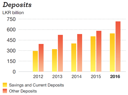 The Bank grew its assets base, the biggest in the industry, further to LKR 1.7 trillion with 6% growth rate. The Bank’s financial wealth is clearly apparent in its Balance Sheet, with interest earning loan portfolio and financial investments accounting for more than 90% of the assets base.