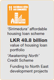 We contribute to this goal through supporting affordable housing; our loan scheme ‘Sirimedura’ is tailored for housing loans. Our housing loan portfolio amounted to LKR 48.8 billion while it also recorded a growth of 14% during the year. Further, we have provided funding to North East development projects and human settlement in the region.