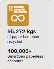 We contribute to sustainable consumption through streamlining our procedures to minimise the use of paper by recycling and moving towards a paperless environment. A total of 95,272 kg of paper has been recycled resulting in saving of trees, electricity, water and landfills. Usage of paper has also been reduced through the SmartGen paperless account which has exceeded 100,000 accounts. The Bank takes continuous efforts to move towards paperless processes and products