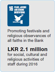 The Bank promotes national integration and reconciliation by a variety of cultural and religious events. These activities include festivals of all communities and religions such as Wesak, Poson, Christmas Carols, Hadji, Ifthicar, Thaipongal and Mahasivarathree which are organised by internal societies of the Bank representing all religions.