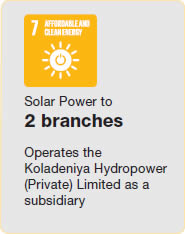 Solar power has been introduced at the Tissamaharama and Kilinochchi Branches which has reduced dependence on fossil fuel-generated energy. The Bank also operates the Koladeniya Hydropower (Private) Limited Company as a subsidiary, which is another contribution to the generation of renewable energy.